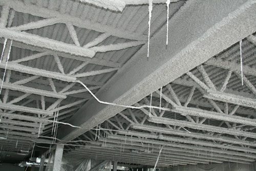 Nous effectuons également la protection des mousses plastiques (soit le polyuréthane giclé ou le polystyrène) qui ne peuvent pas être exposées à l'intérieur d'un bâtiment ou dans certains "vides" de construction. Nous protégeons alors les mousses plastiques avec un enduit cimentaire tel le Monokote Z-3306 de GCP Applied Technologies ou avec une peinture intumescente de couleur blanche. Cette dernière gonfle et se carbonise au contact de la chaleur afin de créer une barrière de protection sur l'isolant.